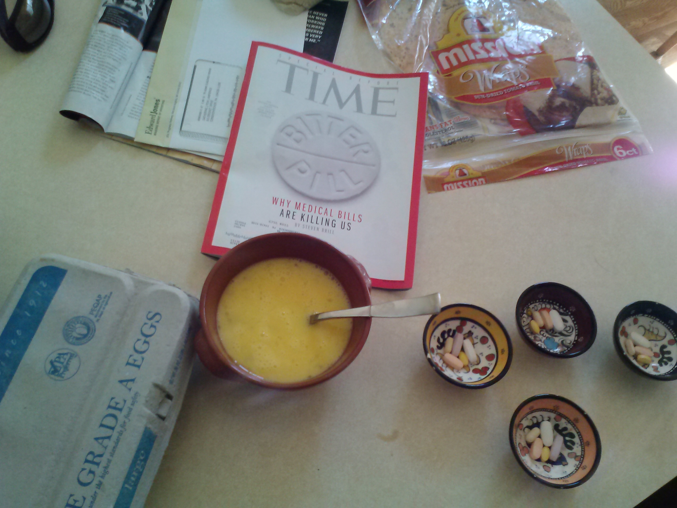 I worked from home, so had a bit more time in the morning. I made scrambled eggs (no cheese, yogurt or milk, we eat way too much dairy!), on 1/2 a toasted sundried tomato tortilla, topped with a fresh, hot, salsa. And of course, Tapatilo sauce! And all the pills, daily vitamins we’ve taken for years: B12, C, glucosamine and chondroitin (for my running & Mike’s physical job), a womnen’s daily and a b complex. Kind of ironic that we had just received the TIME magazine with the highly discussed Bitter Pill article. A must read about how medial bills are killing us, although the food to health relationship wasn’t mentioned….makes you scratch your head!