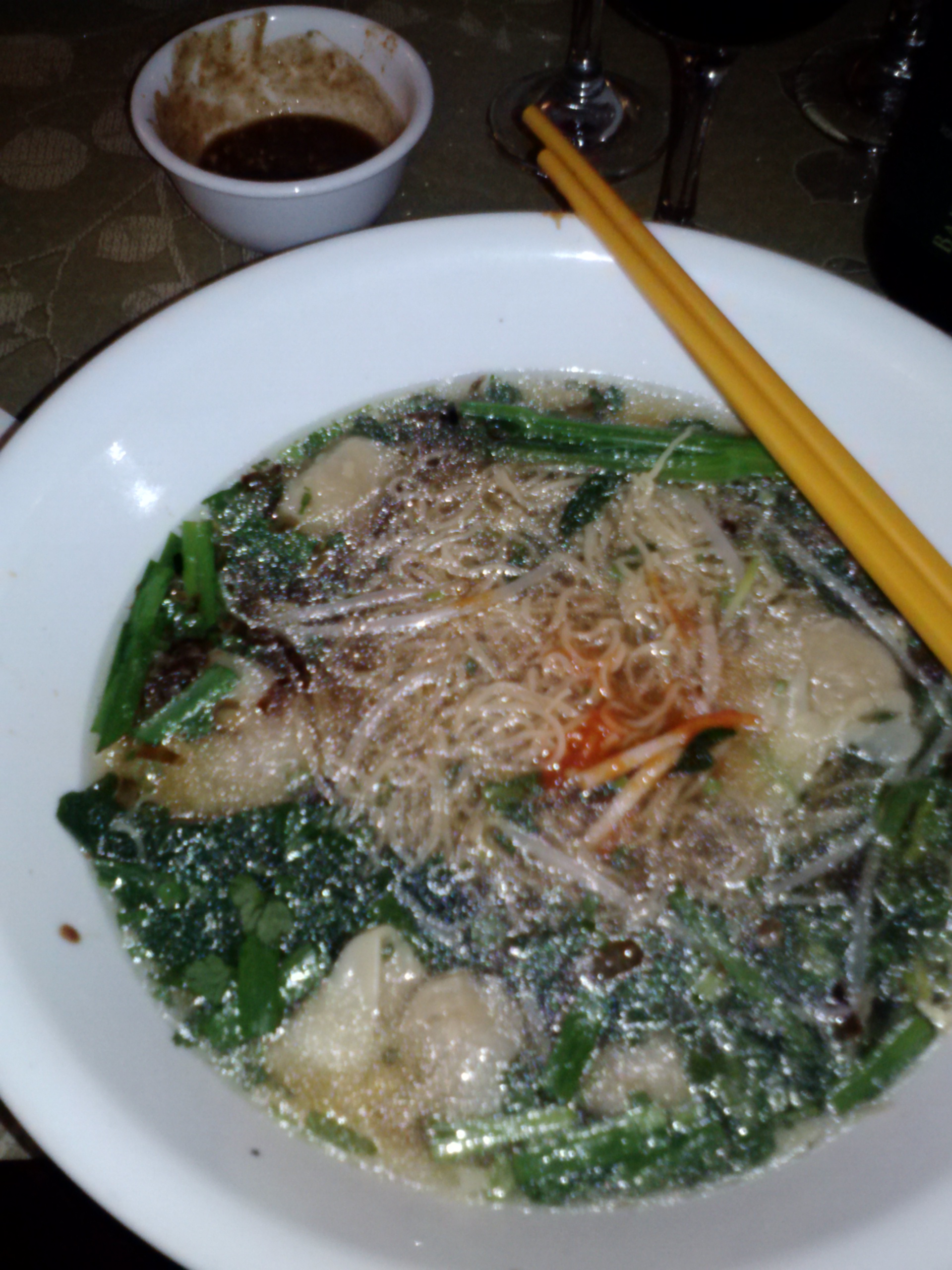 Served with a side dish of bean sprouts and jalapeño peppers, plus two sauces (one sweet, one a bit spicy) the dish came out pipping hot. Egg noodles, scallions, cilantro, fresh line, homemade wonton. FILLED WITH CHICKEN! I bit into one and immediately realized the meat mistake. DOH! It was delicious though, so as not to be a food-waster, I finished that one, and ate around the rest.