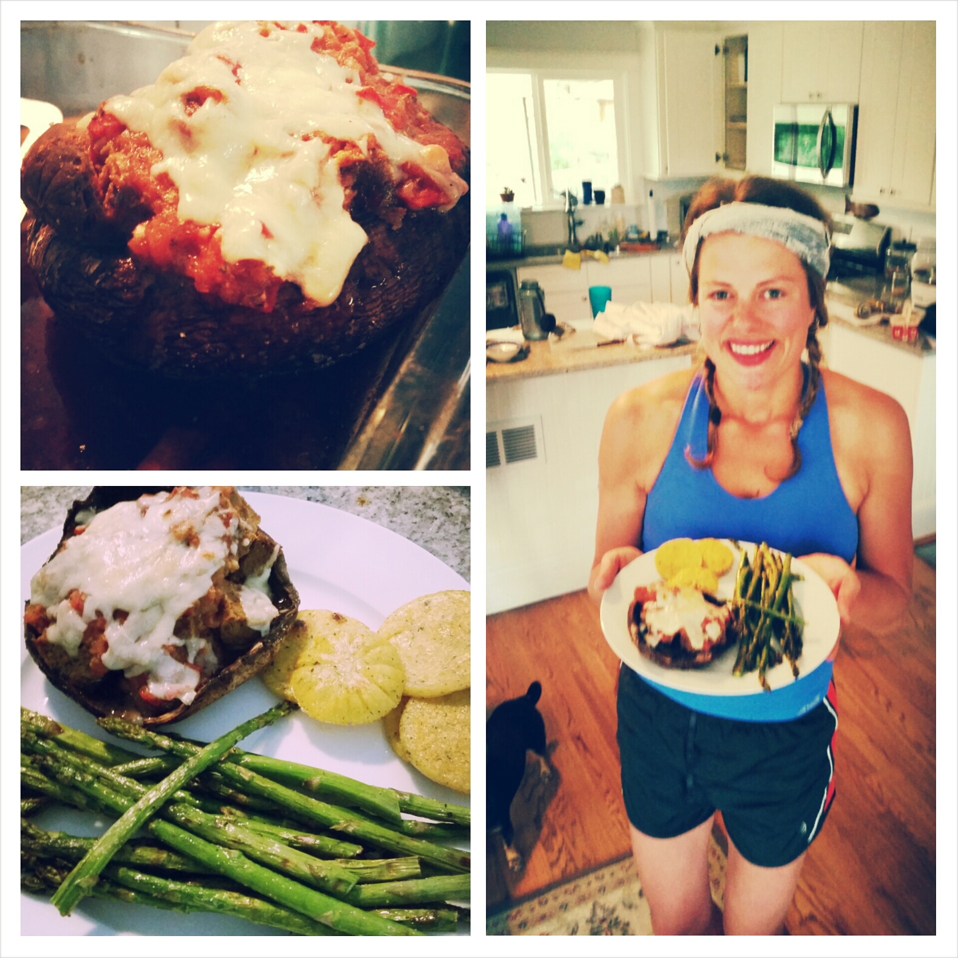 When we arrived home, we were both ravenous! A quick look in the fridge found two HUGE portobello mushrooms, Tofurky Italian Sausage links, some pre-made polenta and asparagus…why not stuff the shrooms with the furky? YES!
