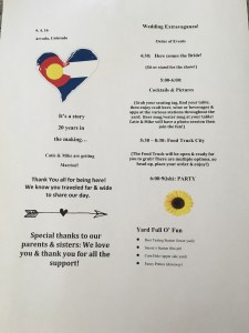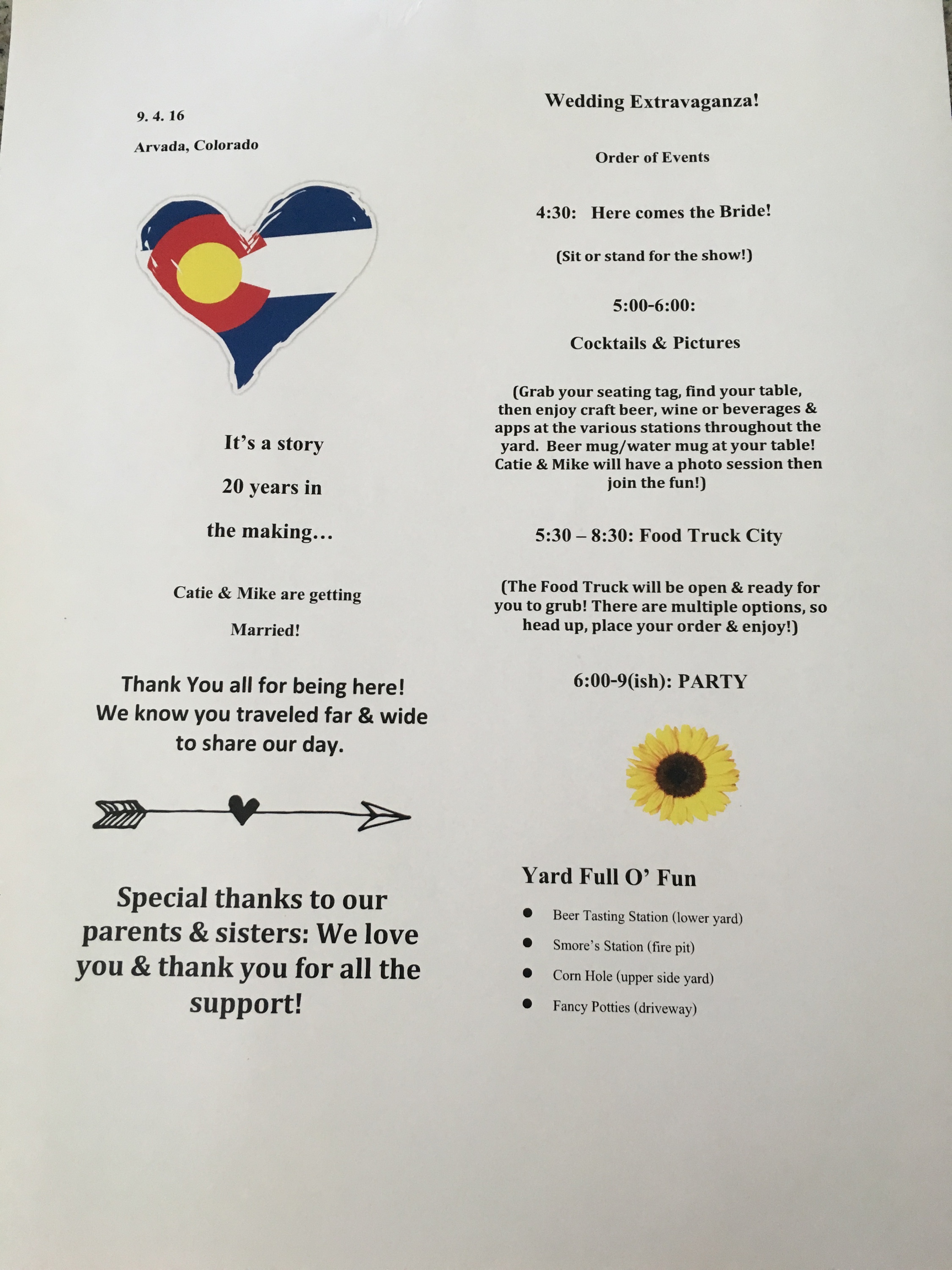 A few months before our wedding weekend, I invited my local friends and family over to help with decorations. Homemade signs, rolled napkins and silverware, seating tags….it was a total DIY approach, but made it a fun activity for those we love to be apart of. There was a Welcome Sign, a Beer Sign, a Smore’s Sign, a Food Truck Sign, and of course, the Colorado flag!