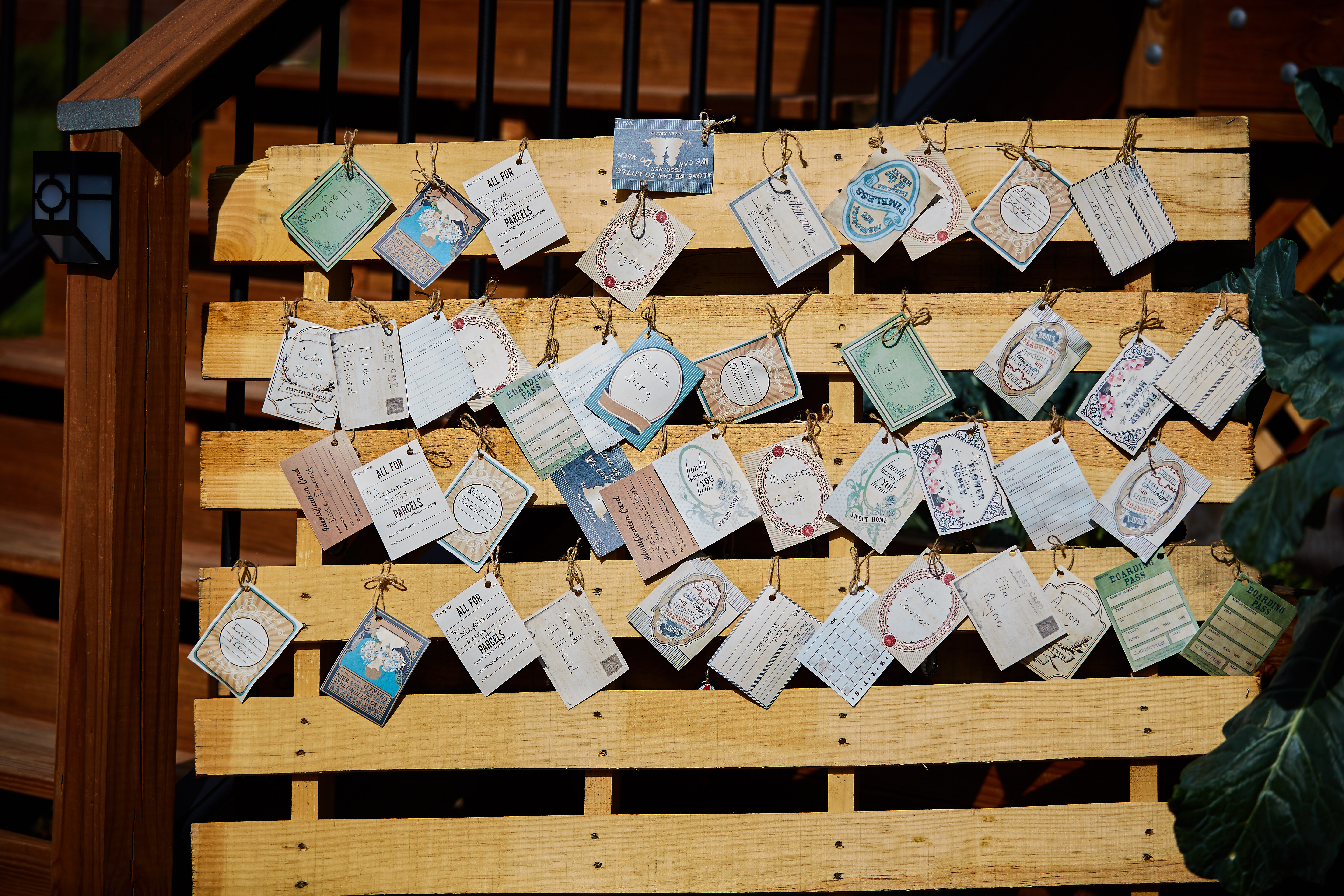 In total, I spent $318 on decorations including: mums, paint for the homemade signs, water pitchers for the tables, a large glass pitcher for water, a small water dispenser for our beer station, lights to string up, name tags for seating assignments, favors (envelopes full of wild flowers) cloth for the table settings (my mom sewed all of the table runners and bought the table clothes for me, so that was awesome and an expense she took care of) and a love grows here sign for our garden. An old pallet acted as the perfect seating chart holder!