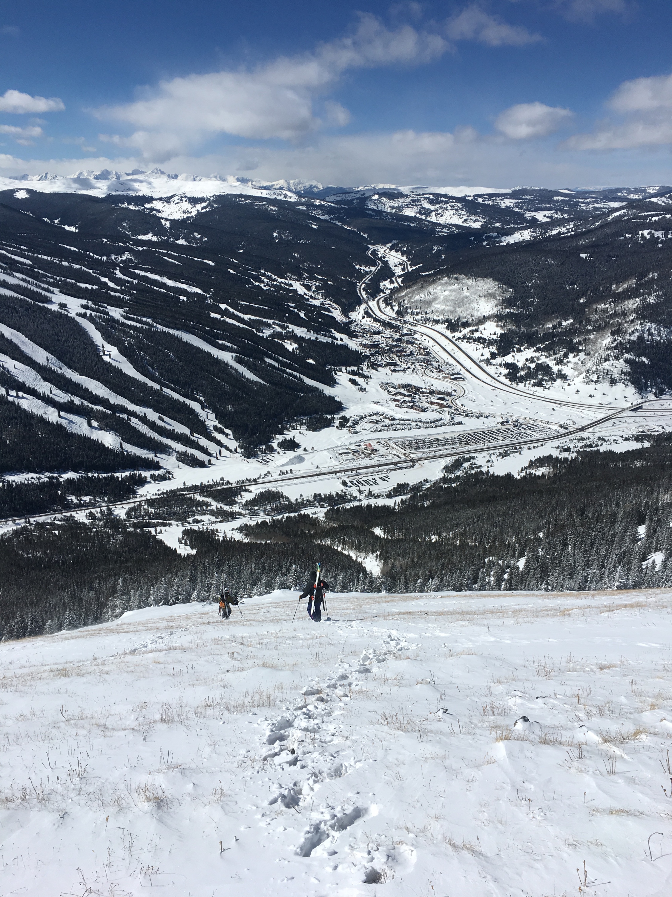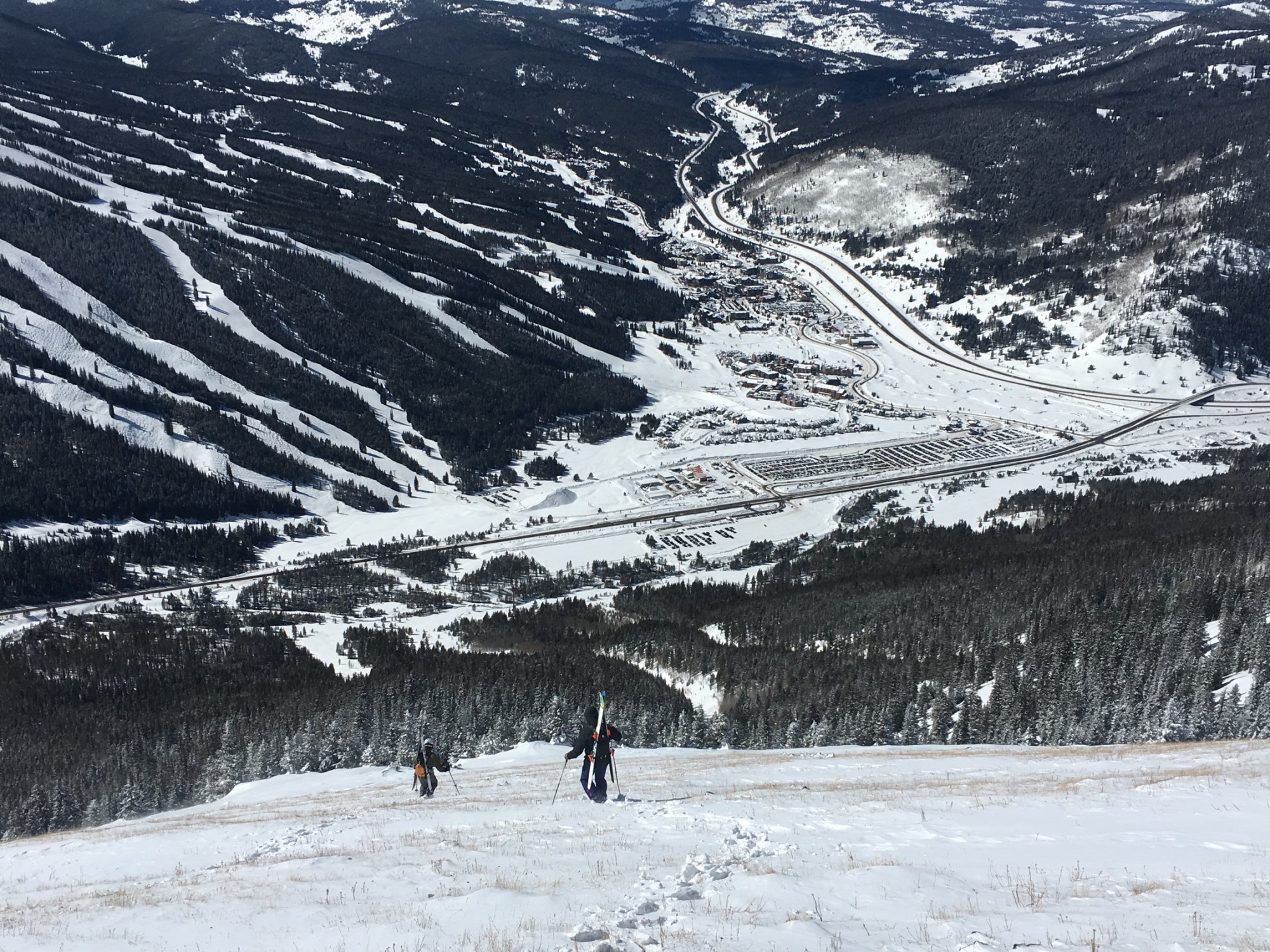 After dropping one car off on the Copper side, the friends drove to Breckenridge, parked their car, and took the Kensho lift up to peak 6. After a small hike up to the summit, the friends went off the backside, hiked down past the windblown areas, and found their line.
