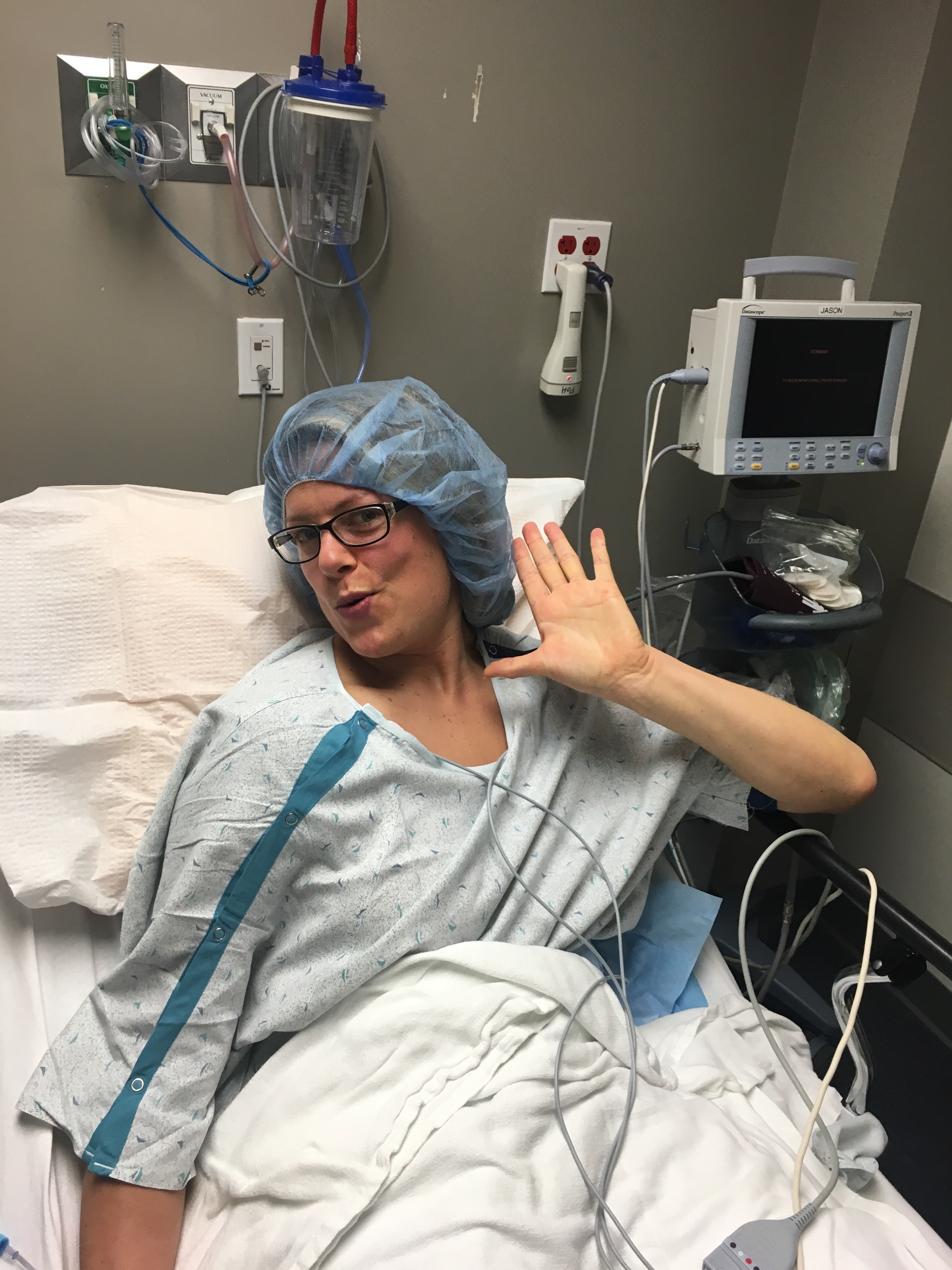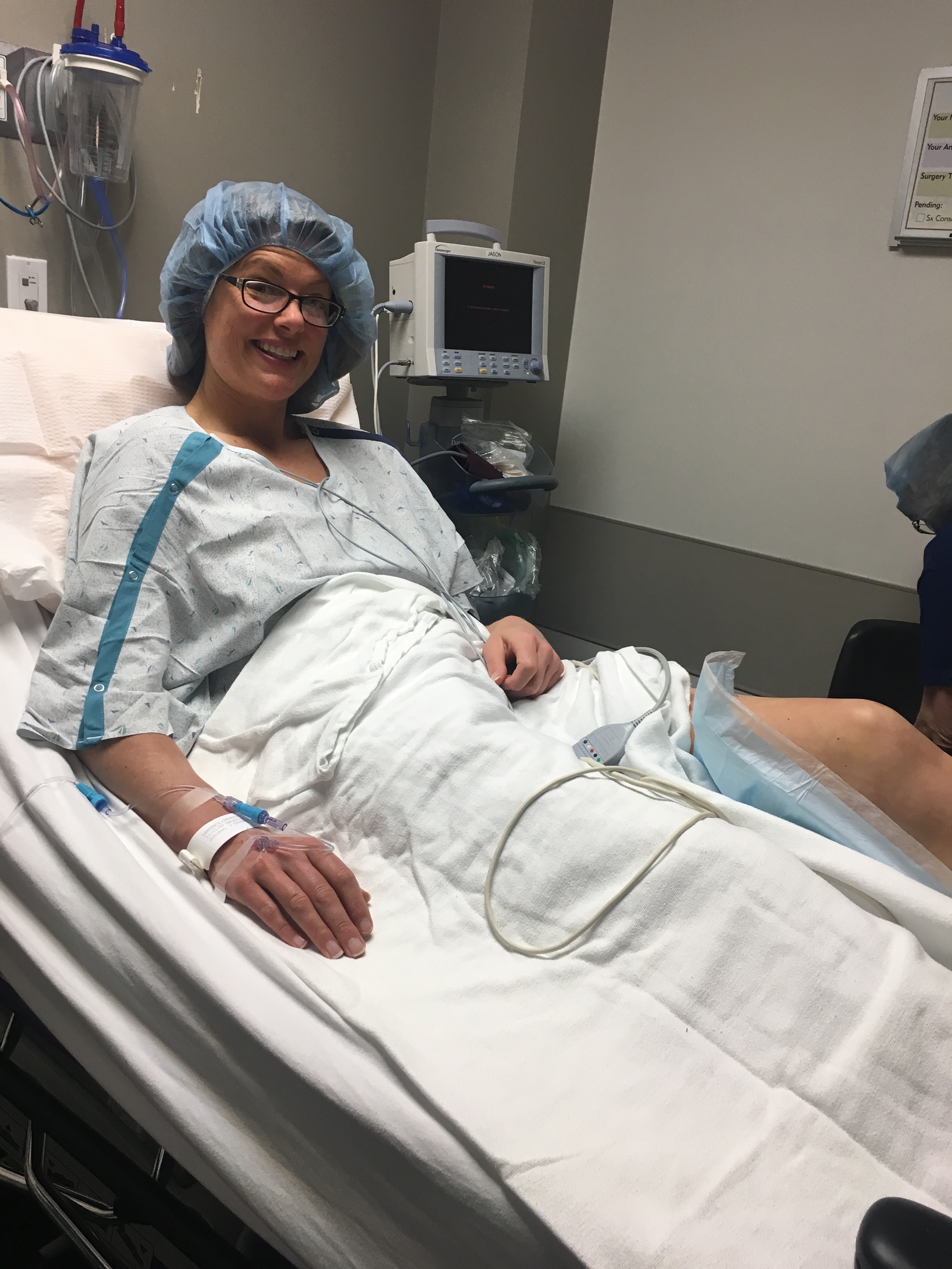 Yesterday began at 6 am, after a wonderful night of sleep, surprisingly enough. Mike dropped me off at the front of the surgery center, I was checked in and taken back to the pre-opp room. The nurse was extremely nice and after I changed into my beautiful gown and stocking cap, complete with a compression sock for my right leg, she put an intervenes  in and we chatted. I asked her how many patients she’d see in a day…23! I was the first of the day, so felt lucky about that!