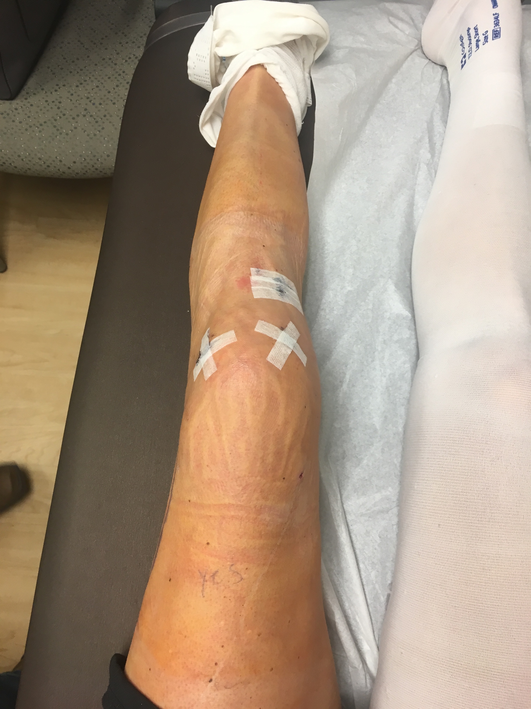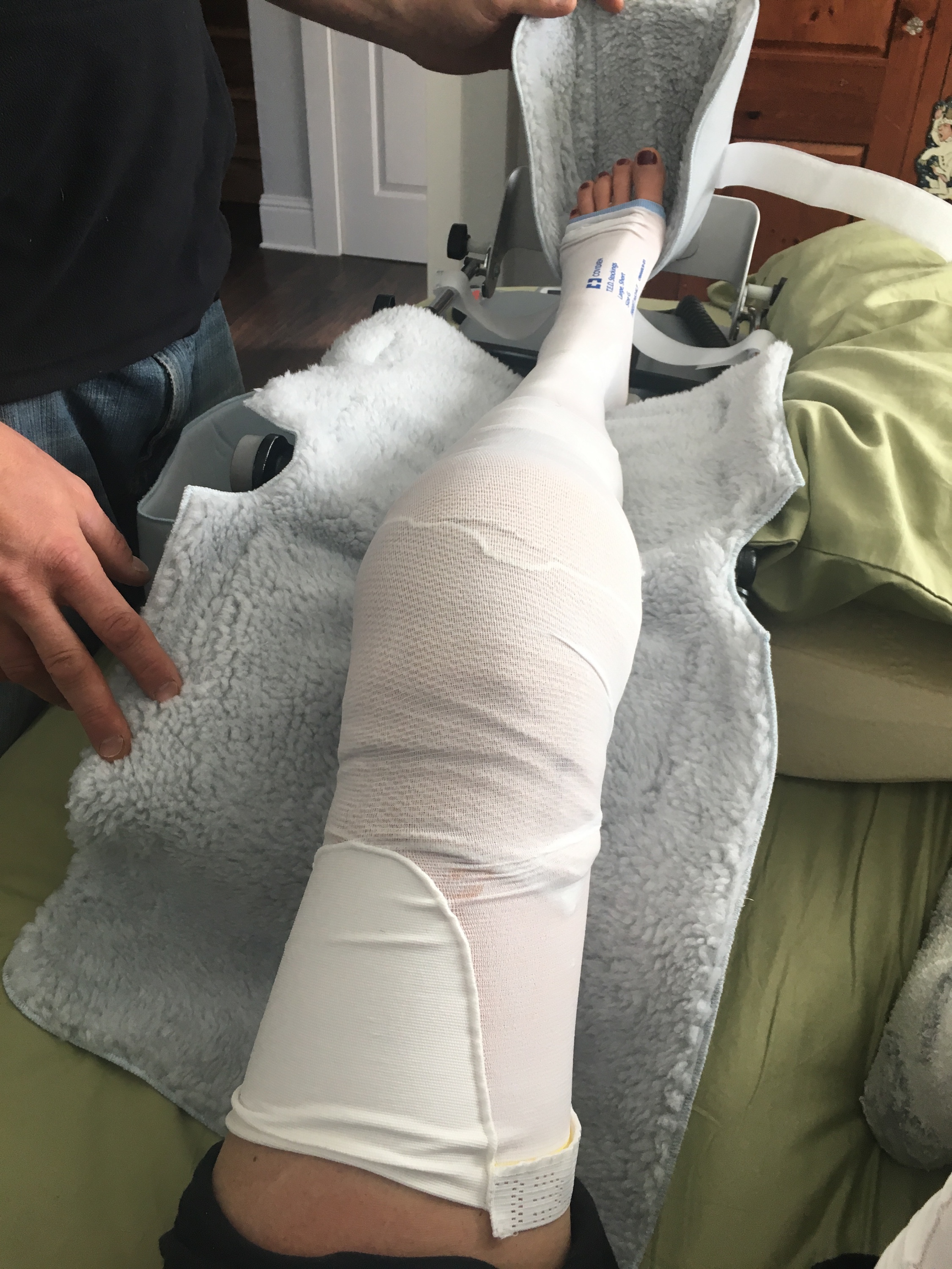 7. High – I went to my post-pop appointment and got great marks from my surgeon’s PA! He said I was healing beautifully, there was no signs of blood clotting and everything was on schedule. Following my appointment I had my first PT session (I get 12 that insurance will cover) and it went well! Will seems nice and he gave me some small things to work on – activating my quad, bending my knee and straightening my leg. Pretty basic exercises but not to be taken lightly.