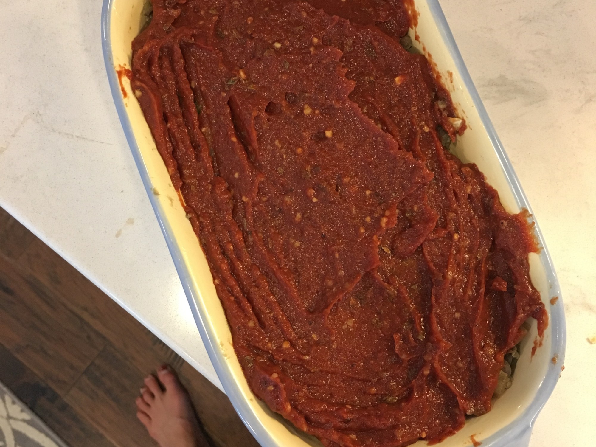 - Top the loaf with the tomato glaze. Bake at 375 for 25-30 minutes – cover the loaf with tin foil, remove for the last 10 minutes.
