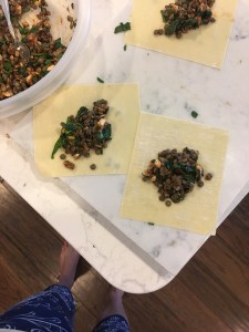 Saturday morning was spent hanging with the babies, taking a walk around the block, then heading back to make a lite lunch. Since I had prepped a Lentil Loaf yesterday for them to eat this week, I thought I would make some Lentil, Mushroom & Spinach wontons for lunch then prep the cauliflower manicotti (I looked for shells to stuff in the grocery store & they only had manicotti – which works!).