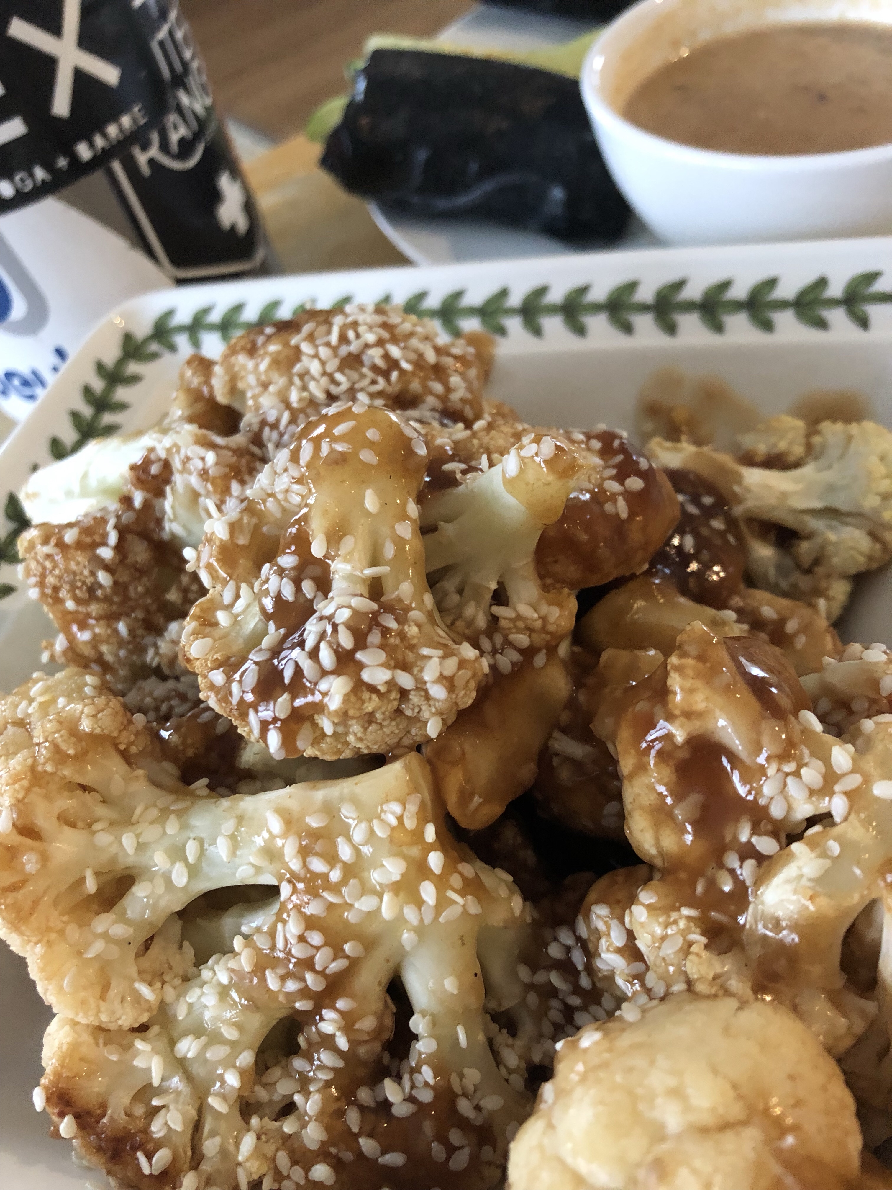 - Korean BBQ cauliflower wings with spring rolls and veggie wontons