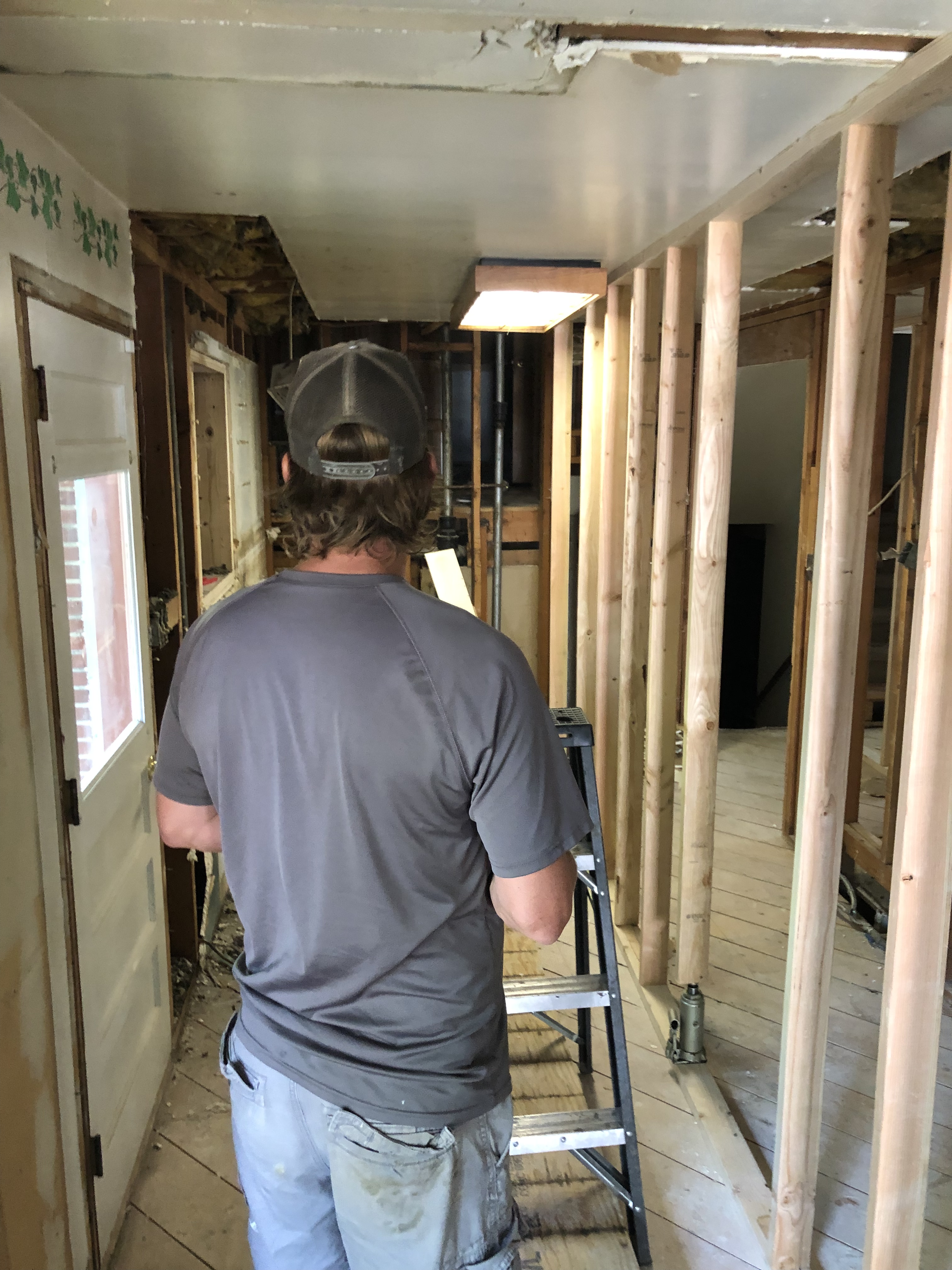 - Removed the kitchen walls & built a beam system. This required engineering sign off (we used DL engineering who were amazing!) Mike building temp walls, pouring concrete pads to carry the load (I personally mixed 1280 lbs of concert & carried about 6 80lb bags down into the basement). This took us several hours on July 5th, my day off, and it was hard, dirty work. But so glad I was there to help!