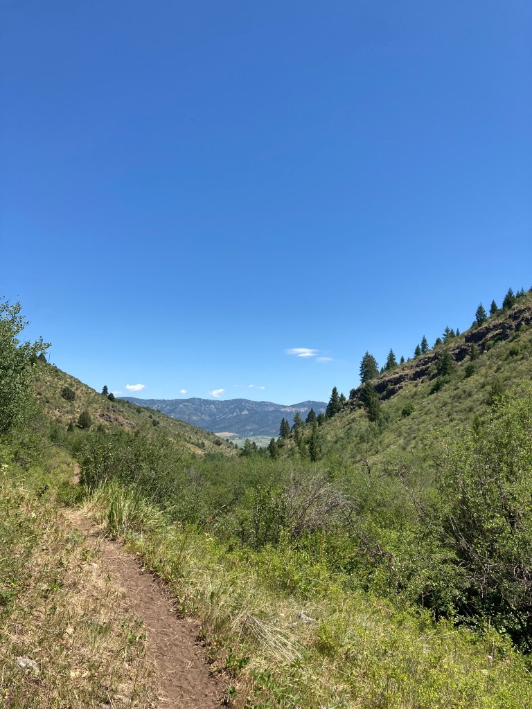 Wednesday, we awoke and did some more camp yoga, then I got to work. Mike agreed to hike with me later in the day, so when I wrapped up work, we chose a trail that was down the mountain, that promised good views and 1,000ft+ of vert. Just what I needed after being on the computer all day! Many of my friends asked how I was able to work on the road – we chose campgrounds that had good signals and I used my phone as a hot spot. It wasn’t a meeting heavy week either, so it really worked out well. The hike was lovely, although it was extremely hot and full of cows. Winnie had a blast running after them – and scaring them quite a bit!